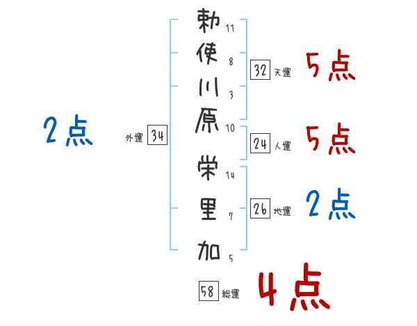 天運![]() | 勅使川原栄里加さんの天運は32画の5つ星!柔軟性があり成功する。チャンスが多く金運が良い。 家系が持つ宿命的な運勢を表します。祖先から受け継いだ苗字ですので自分の力が及びません。家柄を象徴します。 |