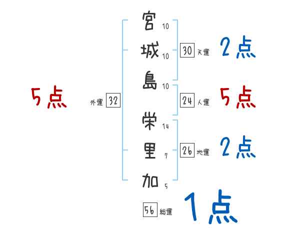 外運![]() | 宮城島栄里加さんの外運は32画の5つ星!柔軟性があり成功する。チャンスが多く金運が良い。 生活面を象徴する運勢です。外部から受ける影響力を表し、結婚運、家庭運や職場、環境への順応性を表します。 |