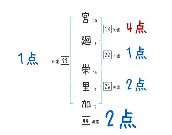 天運![]() | 宮廻栄里加さんの天運は18画の4つ星!情熱的で剛気。忍耐力があり信頼される。 家系が持つ宿命的な運勢を表します。祖先から受け継いだ苗字ですので自分の力が及びません。家柄を象徴します。 |
