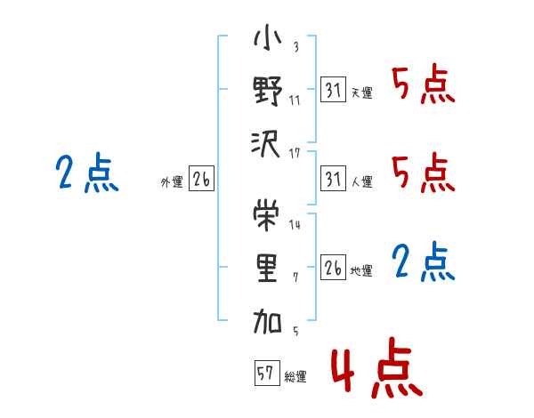 総運![]() | 小野沢栄里加さんの総運は57画の4つ星!向上心があり人望がある。地位を得る。 あなたの人生を表す1番重要な運勢です。生涯を通じて影響する総合運となり、主に50歳以降の晩年期に影響を及ぼします。 |