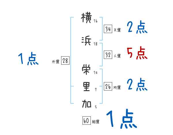 人運![]() | 横浜栄里加さんの人運は32画の5つ星!柔軟性があり成功する。チャンスが多く金運が良い。 性格や才能などを表す2番目に重要な運勢です。人間関係や協調性、社会的な成功に影響します。主に20歳から50歳ぐらいまでの中年期の運勢を表します。 |