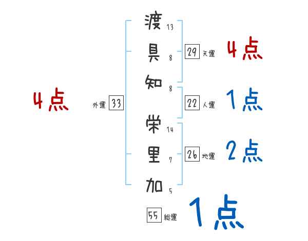 天運![]() | 渡具知栄里加さんの天運は29画の4つ星!完全主義で才能がある。厳格な心の持ち主。 家系が持つ宿命的な運勢を表します。祖先から受け継いだ苗字ですので自分の力が及びません。家柄を象徴します。 |