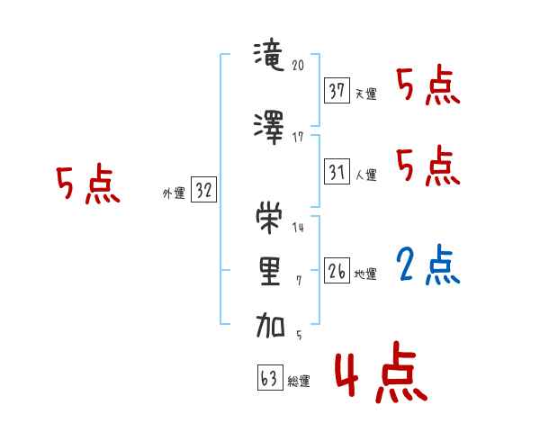 外運![]() | 滝澤栄里加さんの外運は32画の5つ星!柔軟性があり成功する。チャンスが多く金運が良い。 生活面を象徴する運勢です。外部から受ける影響力を表し、結婚運、家庭運や職場、環境への順応性を表します。 |