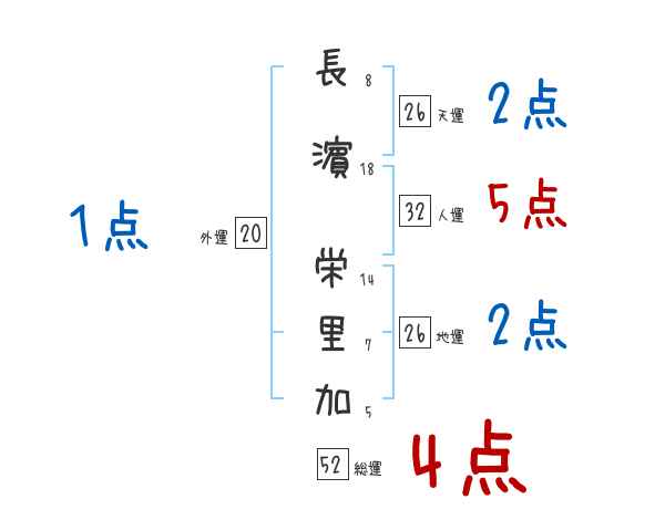 人運![]() | 長濵栄里加さんの人運は32画の5つ星!柔軟性があり成功する。チャンスが多く金運が良い。 性格や才能などを表す2番目に重要な運勢です。人間関係や協調性、社会的な成功に影響します。主に20歳から50歳ぐらいまでの中年期の運勢を表します。 |