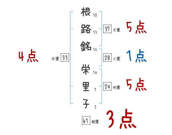 外運![]() | 根路銘栄里子さんの外運は33画の4つ星!権力志向でプライドが高い。勇気があり運を切り開き成功する。 生活面を象徴する運勢です。外部から受ける影響力を表し、結婚運、家庭運や職場、環境への順応性を表します。 |