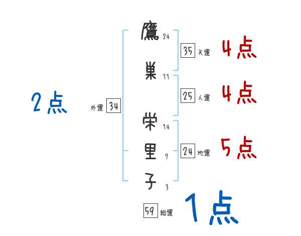 天運![]() | 鷹巣栄里子さんの天運は35画の4つ星!温厚な性格で感受性が高い。穏和な性格で人望が厚い。 家系が持つ宿命的な運勢を表します。祖先から受け継いだ苗字ですので自分の力が及びません。家柄を象徴します。 |