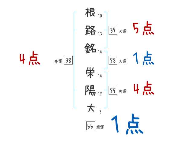 地運![]() | 根路銘栄陽大さんの地運は29画の4つ星!完全主義で才能がある。厳格な心の持ち主。 個性を表す基礎的な運勢です。性格形成や対人関係、行動力など家庭環境に影響されます。主に誕生してから20歳くらいまでの若年期の運勢を表します。 |