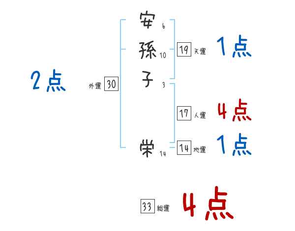 外運![]() | 安孫子栄さんの外運は30画の2つ星!浮き沈みの激しさに注意しましょう。 生活面を象徴する運勢です。外部から受ける影響力を表し、結婚運、家庭運や職場、環境への順応性を表します。 |