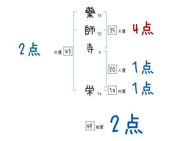 外運![]() | 藥師寺栄さんの外運は43画の2つ星!頑固な性格で独立心が強いかも。やや非現実的で浪費に注意しましょう。 生活面を象徴する運勢です。外部から受ける影響力を表し、結婚運、家庭運や職場、環境への順応性を表します。 |