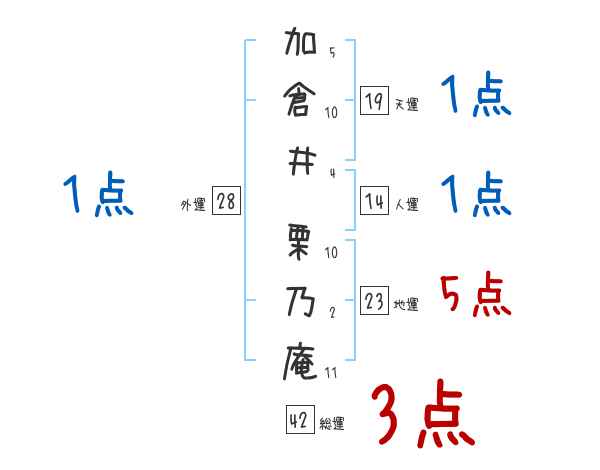 地運![]() | 加倉井栗乃庵さんの地運は23画の5つ星!想像力に優れ活力がある。一代で成功し名誉を手に入れる。 個性を表す基礎的な運勢です。性格形成や対人関係、行動力など家庭環境に影響されます。主に誕生してから20歳くらいまでの若年期の運勢を表します。 |