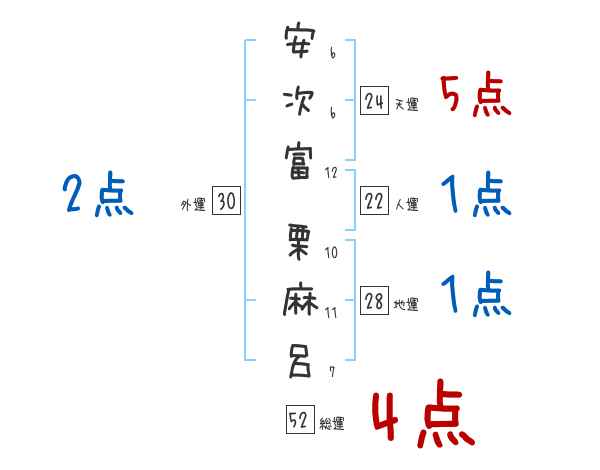 天運![]() | 安次富栗麻呂さんの天運は24画の5つ星!家庭運が良く順調な人生。金運にも恵まれる。 家系が持つ宿命的な運勢を表します。祖先から受け継いだ苗字ですので自分の力が及びません。家柄を象徴します。 |
