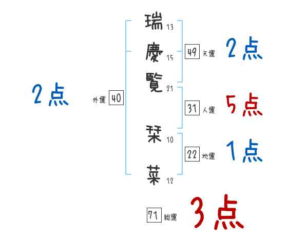 天運![]() | 瑞慶覧栞菜さんの天運は49画の2つ星!不安定な性格で明暗がある人生。周りの人には支援されやすい。 家系が持つ宿命的な運勢を表します。祖先から受け継いだ苗字ですので自分の力が及びません。家柄を象徴します。 |