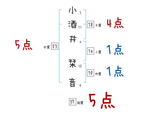 外運![]() | 小酒井栞音さんの外運は23画の5つ星!想像力に優れ活力がある。一代で成功し名誉を手に入れる。 生活面を象徴する運勢です。外部から受ける影響力を表し、結婚運、家庭運や職場、環境への順応性を表します。 |
