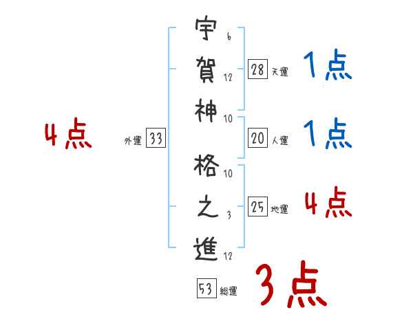 天運![]() | 宇賀神格之進さんの天運は28画の1つ星!家庭環境に注意。スポーツで活躍できる能力があるかも。 家系が持つ宿命的な運勢を表します。祖先から受け継いだ苗字ですので自分の力が及びません。家柄を象徴します。 |