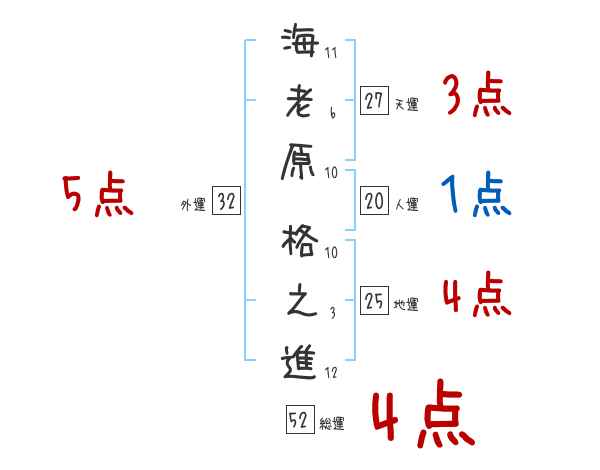 外運![]() | 海老原格之進さんの外運は32画の5つ星!柔軟性があり成功する。チャンスが多く金運が良い。 生活面を象徴する運勢です。外部から受ける影響力を表し、結婚運、家庭運や職場、環境への順応性を表します。 |