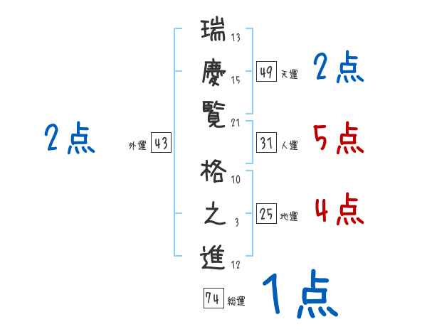 総運![]() | 瑞慶覧格之進さんの総運は74画の1つ星!無気力で怠惰な生活送りがち。規則正しい生活を送るよう気をつけましょう。 あなたの人生を表す1番重要な運勢です。生涯を通じて影響する総合運となり、主に50歳以降の晩年期に影響を及ぼします。 |