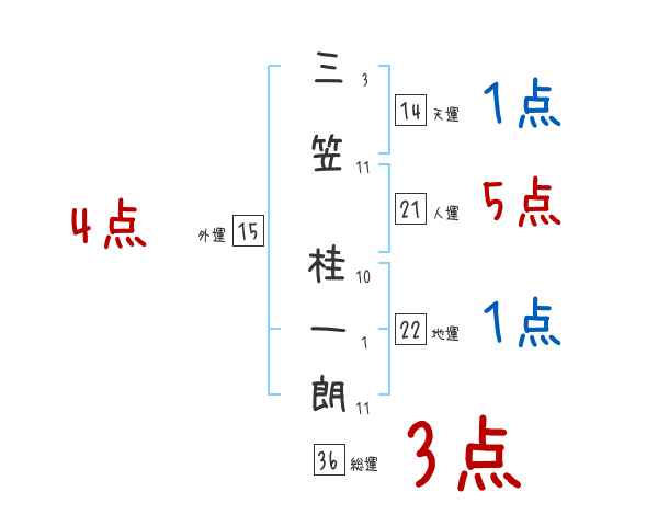 天運![]() | 三笠桂一朗さんの天運は14画の1つ星!人に対して優しいがストレスを溜め込みがち。人間関係のトラブルを避けるよう気をつけましょう。 家系が持つ宿命的な運勢を表します。祖先から受け継いだ苗字ですので自分の力が及びません。家柄を象徴します。 |