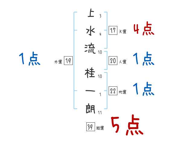 総運![]() | 上水流桂一朗さんの総運は39画の5つ星!社交性に優れ人望が厚い。人の上に立ち成功する。 あなたの人生を表す1番重要な運勢です。生涯を通じて影響する総合運となり、主に50歳以降の晩年期に影響を及ぼします。 |
