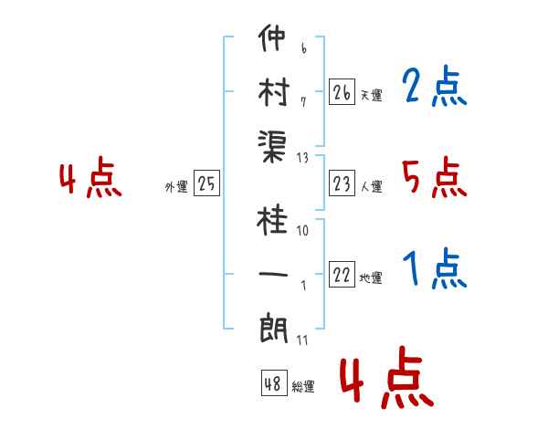 人運![]() | 仲村渠桂一朗さんの人運は23画の5つ星!想像力に優れ活力がある。一代で成功し名誉を手に入れる。 性格や才能などを表す2番目に重要な運勢です。人間関係や協調性、社会的な成功に影響します。主に20歳から50歳ぐらいまでの中年期の運勢を表します。 |