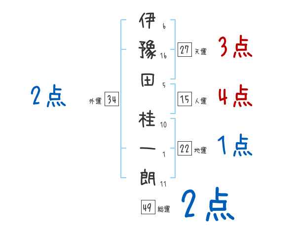 天運![]() | 伊豫田桂一朗さんの天運は27画の3つ星!頭脳明晰だが強情で摩擦が多い傾向。孤立に注意。 家系が持つ宿命的な運勢を表します。祖先から受け継いだ苗字ですので自分の力が及びません。家柄を象徴します。 |