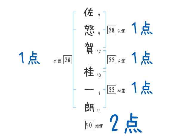 天運![]() | 佐怒賀桂一朗さんの天運は28画の1つ星!家庭環境に注意。スポーツで活躍できる能力があるかも。 家系が持つ宿命的な運勢を表します。祖先から受け継いだ苗字ですので自分の力が及びません。家柄を象徴します。 |