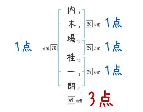 人運![]() | 内木場桂一朗さんの人運は22画の1つ星!努力することが苦手ないっぽう手先が器用。芸術性にも優れる。 性格や才能などを表す2番目に重要な運勢です。人間関係や協調性、社会的な成功に影響します。主に20歳から50歳ぐらいまでの中年期の運勢を表します。 |