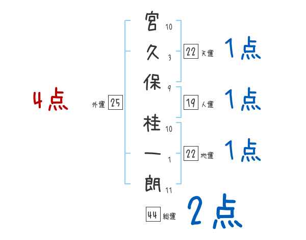 地運![]() | 宮久保桂一朗さんの地運は22画の1つ星!努力することが苦手ないっぽう手先が器用。芸術性にも優れる。 個性を表す基礎的な運勢です。性格形成や対人関係、行動力など家庭環境に影響されます。主に誕生してから20歳くらいまでの若年期の運勢を表します。 |