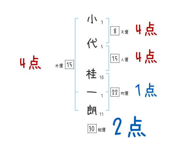 外運![]() | 小代桂一朗さんの外運は15画の4つ星!人徳があり出世する。順調に物事を進め円満な人生。 生活面を象徴する運勢です。外部から受ける影響力を表し、結婚運、家庭運や職場、環境への順応性を表します。 |