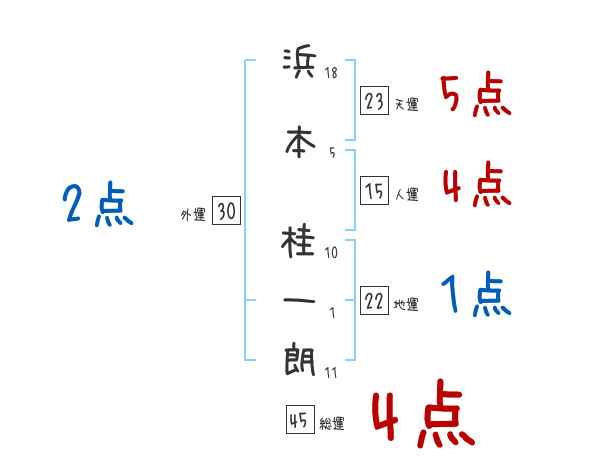 天運![]() | 浜本桂一朗さんの天運は23画の5つ星!想像力に優れ活力がある。一代で成功し名誉を手に入れる。 家系が持つ宿命的な運勢を表します。祖先から受け継いだ苗字ですので自分の力が及びません。家柄を象徴します。 |