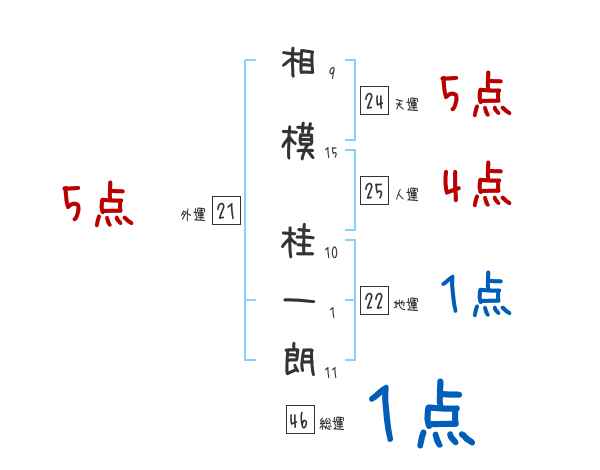 天運![]() | 相模桂一朗さんの天運は24画の5つ星!家庭運が良く順調な人生。金運にも恵まれる。 家系が持つ宿命的な運勢を表します。祖先から受け継いだ苗字ですので自分の力が及びません。家柄を象徴します。 |