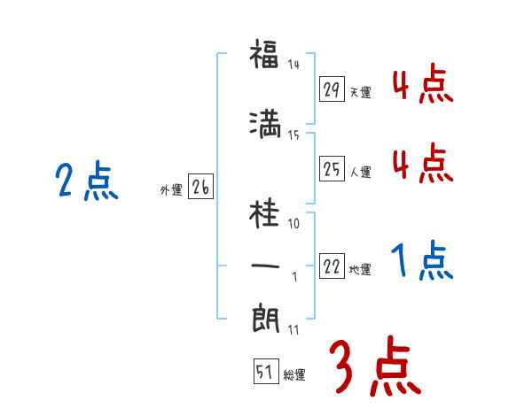 外運![]() | 福満桂一朗さんの外運は26画の2つ星!波瀾万丈かも。信頼できる人を大事にしましょう。 生活面を象徴する運勢です。外部から受ける影響力を表し、結婚運、家庭運や職場、環境への順応性を表します。 |