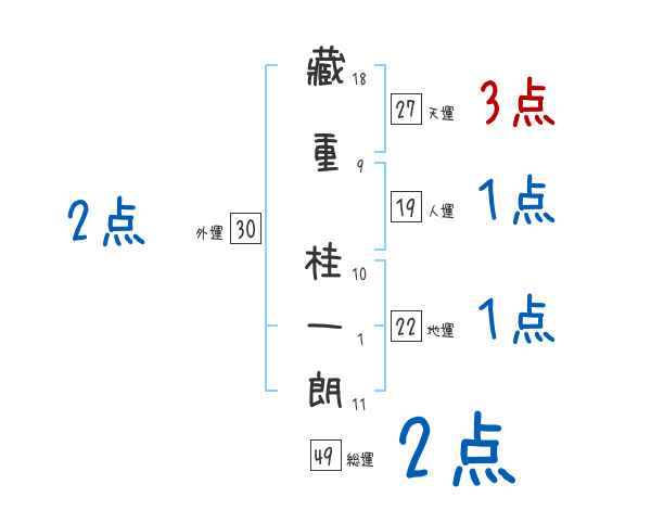 天運![]() | 藏重桂一朗さんの天運は27画の3つ星!頭脳明晰だが強情で摩擦が多い傾向。孤立に注意。 家系が持つ宿命的な運勢を表します。祖先から受け継いだ苗字ですので自分の力が及びません。家柄を象徴します。 |