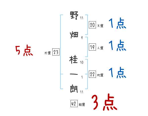 地運![]() | 野畑桂一朗さんの地運は22画の1つ星!努力することが苦手ないっぽう手先が器用。芸術性にも優れる。 個性を表す基礎的な運勢です。性格形成や対人関係、行動力など家庭環境に影響されます。主に誕生してから20歳くらいまでの若年期の運勢を表します。 |