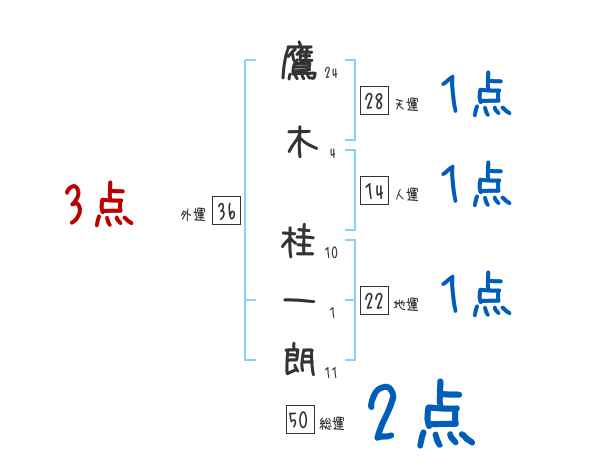 天運![]() | 鷹木桂一朗さんの天運は28画の1つ星!家庭環境に注意。スポーツで活躍できる能力があるかも。 家系が持つ宿命的な運勢を表します。祖先から受け継いだ苗字ですので自分の力が及びません。家柄を象徴します。 |