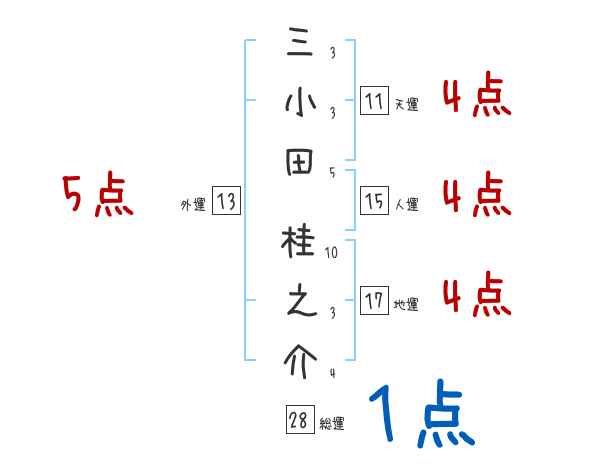 天運![]() | 三小田桂之介さんの天運は11画の4つ星!着実に富や地位を得る幸運な人生。 家系が持つ宿命的な運勢を表します。祖先から受け継いだ苗字ですので自分の力が及びません。家柄を象徴します。 |