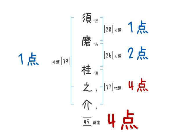 天運![]() | 須磨桂之介さんの天運は28画の1つ星!家庭環境に注意。スポーツで活躍できる能力があるかも。 家系が持つ宿命的な運勢を表します。祖先から受け継いだ苗字ですので自分の力が及びません。家柄を象徴します。 |
