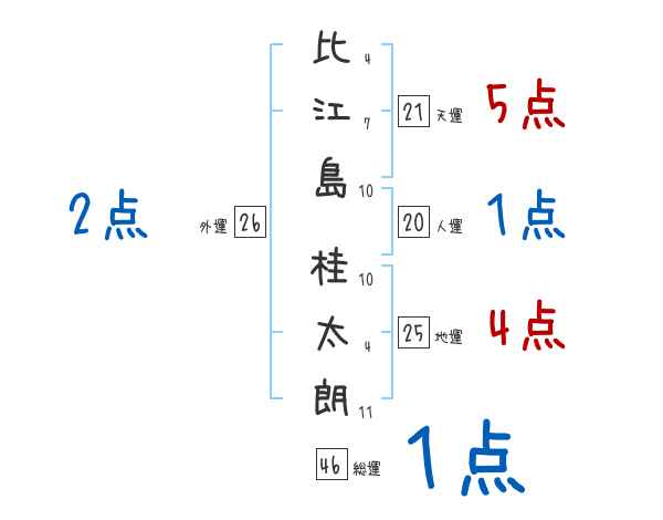 天運![]() | 比江島桂太朗さんの天運は21画の5つ星!統率力がある。独立し成功する。名誉を手に入れる。 家系が持つ宿命的な運勢を表します。祖先から受け継いだ苗字ですので自分の力が及びません。家柄を象徴します。 |
