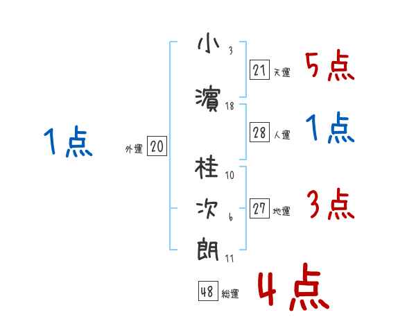 天運![]() | 小濵桂次朗さんの天運は21画の5つ星!統率力がある。独立し成功する。名誉を手に入れる。 家系が持つ宿命的な運勢を表します。祖先から受け継いだ苗字ですので自分の力が及びません。家柄を象徴します。 |
