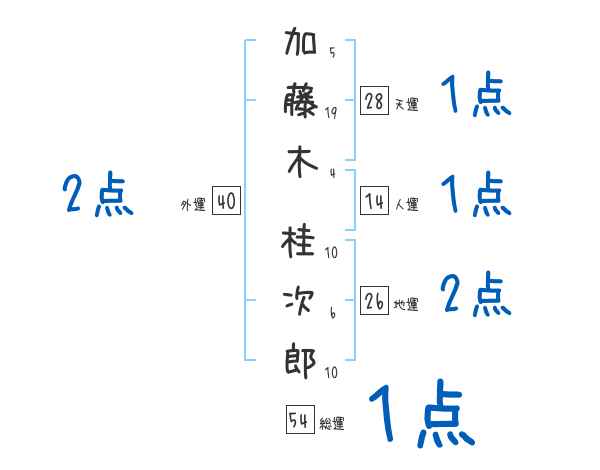 総運![]() | 加藤木桂次郎さんの総運は54画の1つ星!トラブルが多いかも。周りをよく見て協調して過ごしましょう。 あなたの人生を表す1番重要な運勢です。生涯を通じて影響する総合運となり、主に50歳以降の晩年期に影響を及ぼします。 |