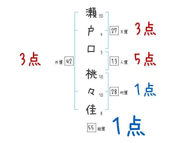 外運![]() | 瀬戸口桃々佳さんの外運は42画の3つ星!病気に注意。多芸であるが消極的でおとなしい。 生活面を象徴する運勢です。外部から受ける影響力を表し、結婚運、家庭運や職場、環境への順応性を表します。 |