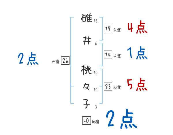 外運![]() | 碓井桃々子さんの外運は26画の2つ星!波瀾万丈かも。信頼できる人を大事にしましょう。 生活面を象徴する運勢です。外部から受ける影響力を表し、結婚運、家庭運や職場、環境への順応性を表します。 |