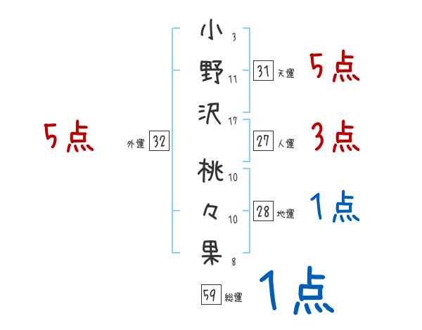 外運![]() | 小野沢桃々果さんの外運は32画の5つ星!柔軟性があり成功する。チャンスが多く金運が良い。 生活面を象徴する運勢です。外部から受ける影響力を表し、結婚運、家庭運や職場、環境への順応性を表します。 |