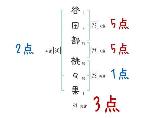 総運![]() | 谷田部桃々果さんの総運は51画の3つ星!変化が激しく、危険に注意。堅実な性格。 あなたの人生を表す1番重要な運勢です。生涯を通じて影響する総合運となり、主に50歳以降の晩年期に影響を及ぼします。 |