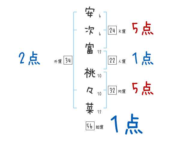 天運![]() | 安次富桃々菜さんの天運は24画の5つ星!家庭運が良く順調な人生。金運にも恵まれる。 家系が持つ宿命的な運勢を表します。祖先から受け継いだ苗字ですので自分の力が及びません。家柄を象徴します。 |