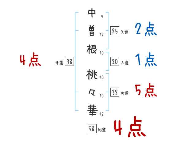 外運![]() | 中曽根桃々華さんの外運は38画の4つ星!温厚な性格で技術的な才能を発揮する。職人的な仕事に向いている。 生活面を象徴する運勢です。外部から受ける影響力を表し、結婚運、家庭運や職場、環境への順応性を表します。 |