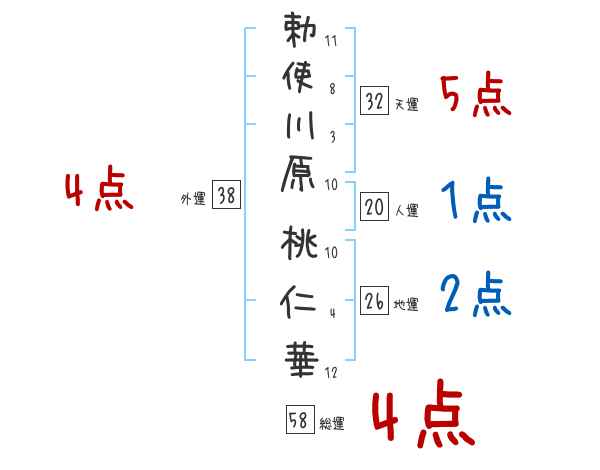 天運![]() | 勅使川原桃仁華さんの天運は32画の5つ星!柔軟性があり成功する。チャンスが多く金運が良い。 家系が持つ宿命的な運勢を表します。祖先から受け継いだ苗字ですので自分の力が及びません。家柄を象徴します。 |