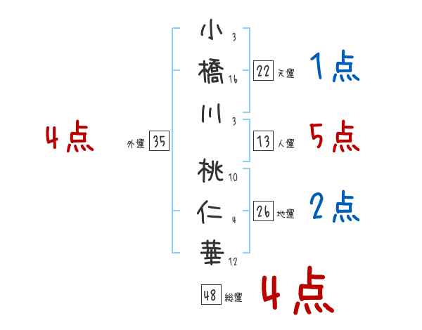 人運![]() | 小橋川桃仁華さんの人運は13画の5つ星!才能に恵まれ人気がある。名声を手に入れる。円満な人生。 性格や才能などを表す2番目に重要な運勢です。人間関係や協調性、社会的な成功に影響します。主に20歳から50歳ぐらいまでの中年期の運勢を表します。 |