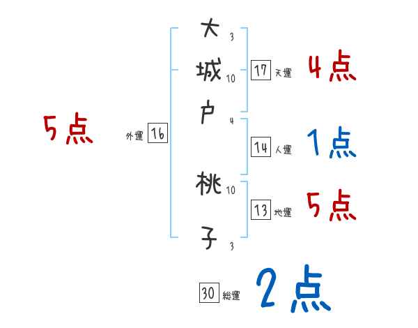 外運![]() | 大城戸桃子さんの外運は16画の5つ星!人望が厚く大きく発展する。逆転成功が見える。 生活面を象徴する運勢です。外部から受ける影響力を表し、結婚運、家庭運や職場、環境への順応性を表します。 |