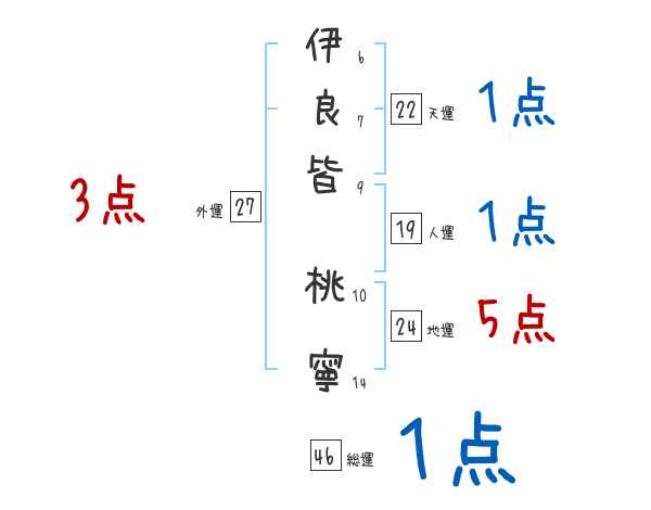 総運![]() | 伊良皆桃寧さんの総運は46画の1つ星!迷走することが多く苦労するかも。目先のことにとらわれないように。 あなたの人生を表す1番重要な運勢です。生涯を通じて影響する総合運となり、主に50歳以降の晩年期に影響を及ぼします。 |