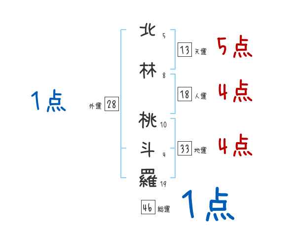 天運![]() | 北林桃斗羅さんの天運は13画の5つ星!才能に恵まれ人気がある。名声を手に入れる。円満な人生。 家系が持つ宿命的な運勢を表します。祖先から受け継いだ苗字ですので自分の力が及びません。家柄を象徴します。 |